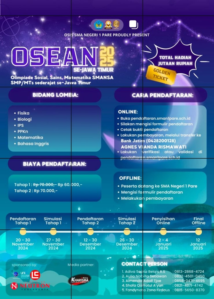 SMAN 1 Pare Kabupaten Kediri dengan bangga menjadi tuan rumah OSEAN 2025 (Olimpiade Sosial, Sains, Matematika SMANSA), sebuah ajang kompetisi akademik bergengsi tingkat Jawa Timur untuk siswa SMP/MTs sederajat. Acara ini akan berlangsung dalam berbagai tahap mulai akhir 2024 hingga awal 2025.